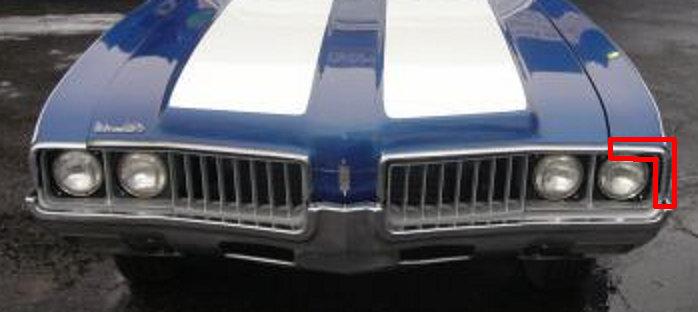 FENDER TO HEADLIGHT FILLER ,RIGHT 69 CUTLASS 442