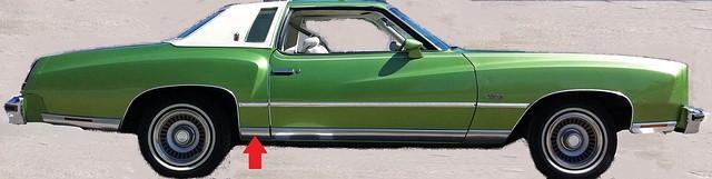 Quarter panel molding or chrome trim, lower front, passenger side, mounts in front of rear of wheel, aluminum trim. used original