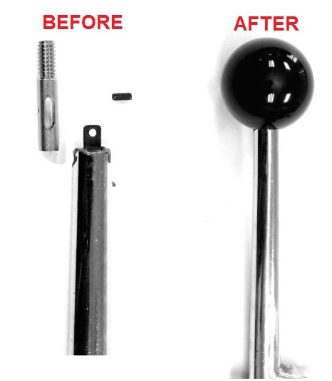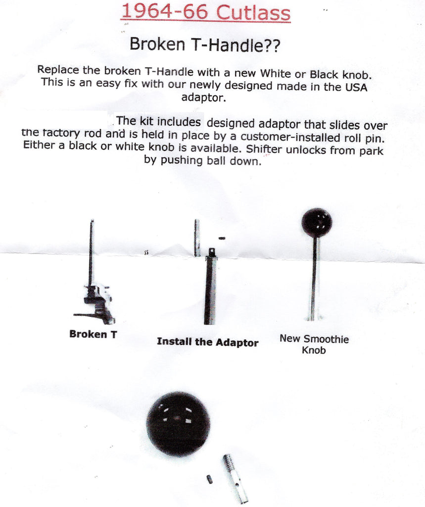 Floor Shifter knob or ball , black round ball, replaces your broken T - handle, comes with adaptor that slides over the factory rod and is held in place by roll pin. Shifter unlocks from park by pushing ball down, for automatic transmission, new repro , replaces OE# 383102