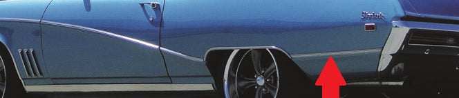 Quarter panel lower molding or trim, fits either side, rear of wheel to bumper, for 2 door models, stainless steel, 28"Long, has slanted ends, used each, OE# 7795323